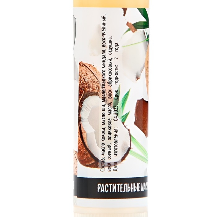 Состав: масло кокоса, масло ши, масло сладкого миндаля, воск пчелиный, воск соевый, оливковое масло, воск абрикосовый, отдушка.