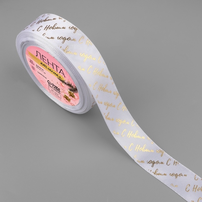 Новый год! Лента атласная с тиснением «С Новым годом», 25 мм, 23 ± 1 м, цвет белый/золотой №01