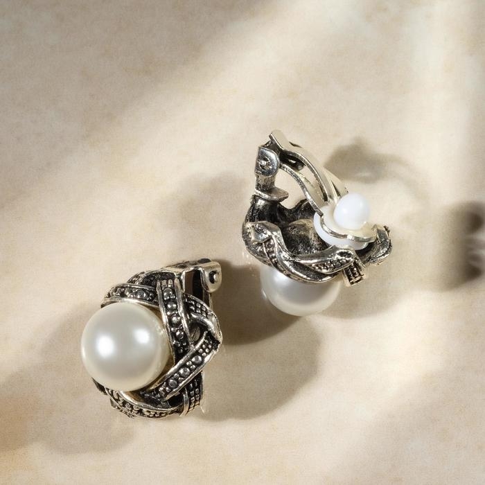 Клипсы «Грейс» внахлёст с бусиной, цвет белый в чернёном серебре