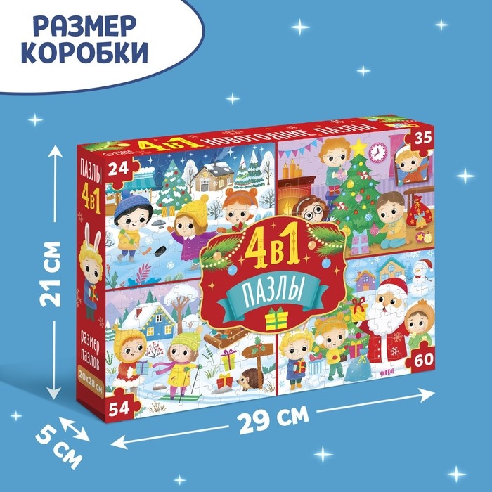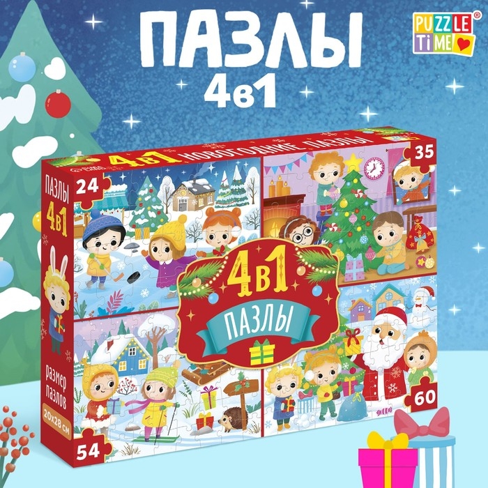 Пазлы 4 в 1 «Новогодние развлечения», 24, 35, 54, 60 элементов