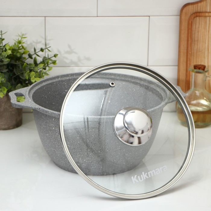 Кастрюля Kukmara сделана из литого алюминия. Имеет инновационное антипригарное мраморное покрытие на водной основе, которое изготовлено по немецкой технологии (Weilburger Coatings GmbH) и усилено сверхтвёрдыми частицами минералов.
