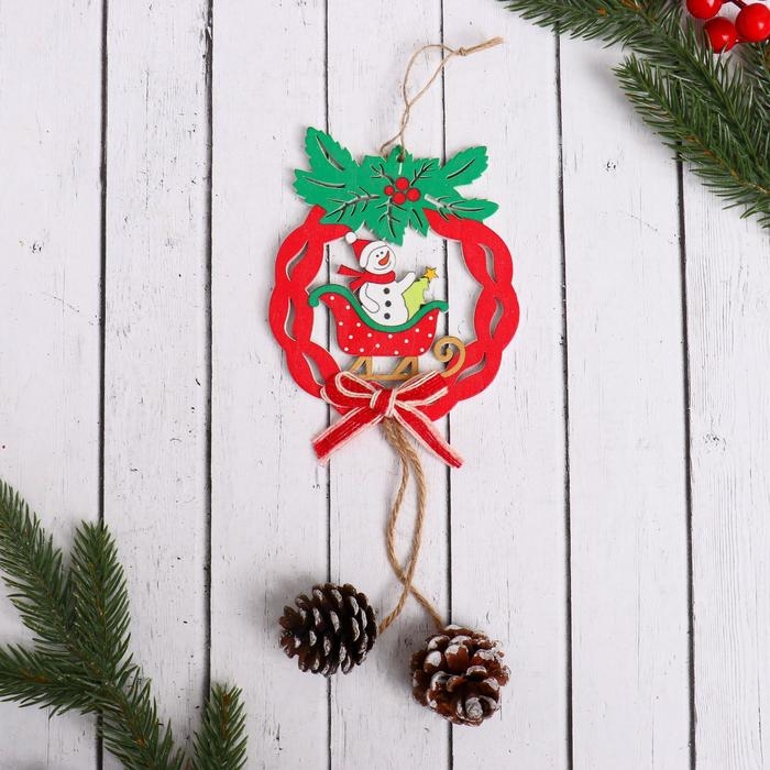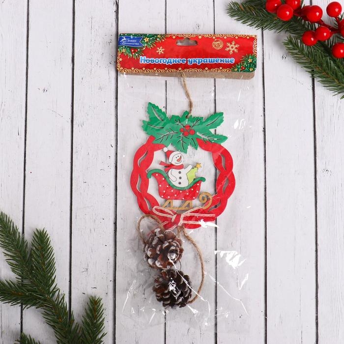 Украшение ёлочное "Рождественский венок с шишками" снеговик в санках 10х23 см