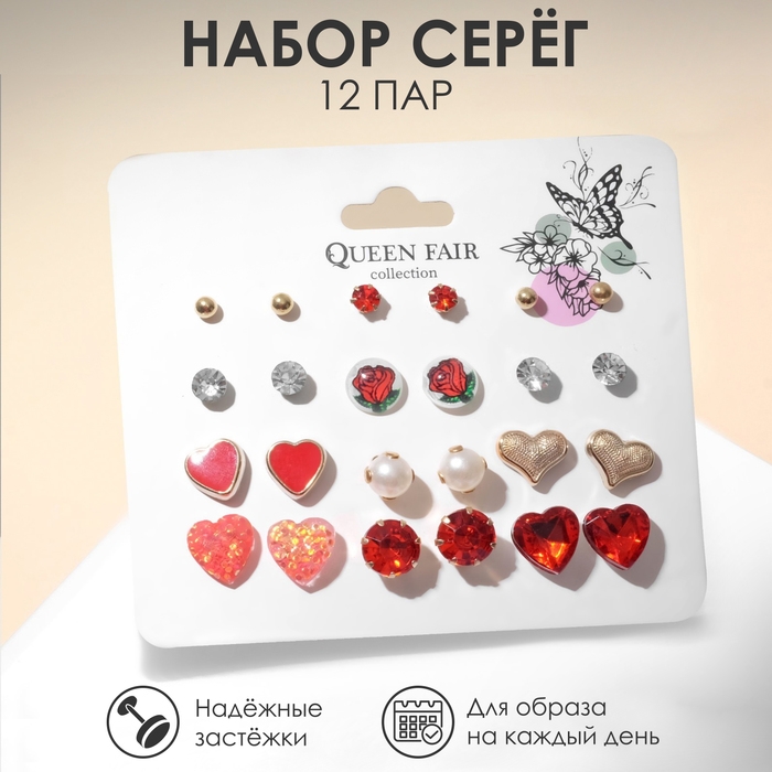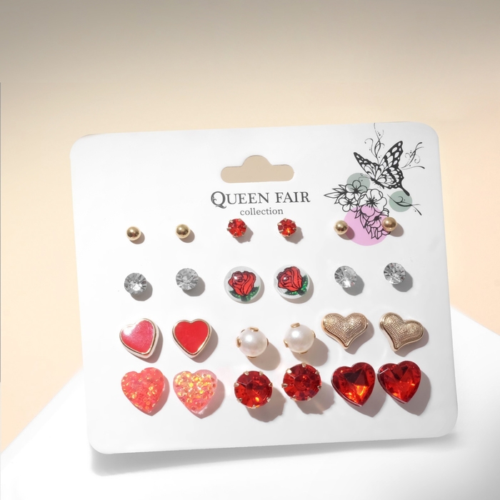 Пусеты 12 пар «Сердечки» романтика, цветные в золоте