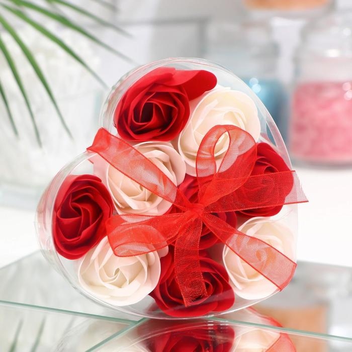Набор мыльных роз в коробке 8 штук, розово-белые с зайчиком