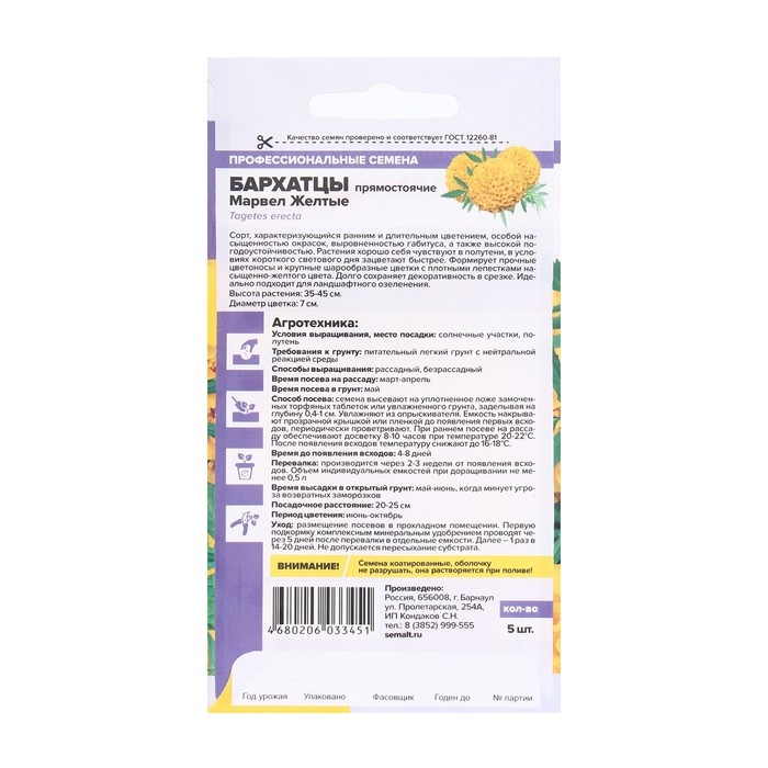 Семена цветов Бархатцы "Марвел", желтые, Сем. Алт, ц/п, 5 шт