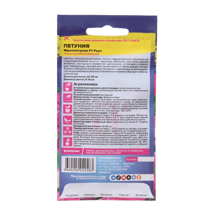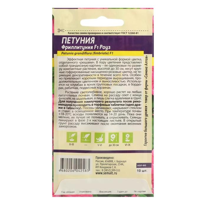 Эффектная петуния с уникальной формой цветка, отделанного «рюшами». В пору цветения представляет собой грандиозную картину – ее одинаковые по размеру компактные растения, высотой до 30 см, несут крупные гофрированные насыщенно-розовые цветки, не теряющие декоративности в течение всего лета. Особенно привлекает коротким периодом выращивания, продолжительным цветением и выносливостью. Используется на клумбах в ярких групповых посадках, в бордюрах, рабатках, подвесных корзинах. Светолюбивое и достаточно засухоустойчивое растение. Предпочитает легкие плодородные, хорошо дренированные почвы. Посевы на рассаду проводят с середины февраля. Семена равномерно распределяют по поверхности субстрата, не заделывая, а лишь слегка вдавливая в грунт. Для получения наилучшего результата посев рекомендуем проводить в торфяные таблетки (одно драже в таблетку). Посевы увлажняют из распылителя и накрывают стеклом для поддержания постоянной влажности. Емкость помещают в светлое теплое место (+22-24°С). Всходы появляются через 10-15 дней, стекло убирают. Февральским посевам требуется дополнительная подсветка. Пока всходы мелкие, их лучше не поливать, а опрыскивать, избегайте попадания на них прямых солнечных лучей. Пикировку проводят в фазе 1-2-х настоящих листочков. В открытый грунт рассаду высаживают в конце мая - начале июня, когда минует угроза возвратных заморозков. Посадочный интервал – 30-40 см. Возможно сохранение растений зимой в освещенном помещении при температуре около +12°С с предварительной обрезкой побегов. Внимание! Семена дражированные - оболочку драже не разрушать!