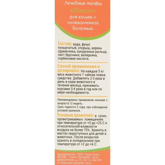Лечебные травы "Пижон" для кошек с мочекаменной болезнью, 50 млМочегонное и противовоспалительное средство, является мощным профилактическим средством от образования камней и песка в почках, оказывает бактерицидное, успокаивающее действие, обладает детокс-эффектом. Нормализует водно-солевой баланс организма, оказывает мягкий мочегонный эффект.Состав: вода, фукус пузырчатый, спорыш, корень одуванчика, кукурузные рыльца, лист брусники, валерьяна, сорбиновая кислота.На каждые 5 кг веса животного 1 чайная ложка средства 2-3 раза в день в корм животного в течение месяца. 3-4 раза в год.