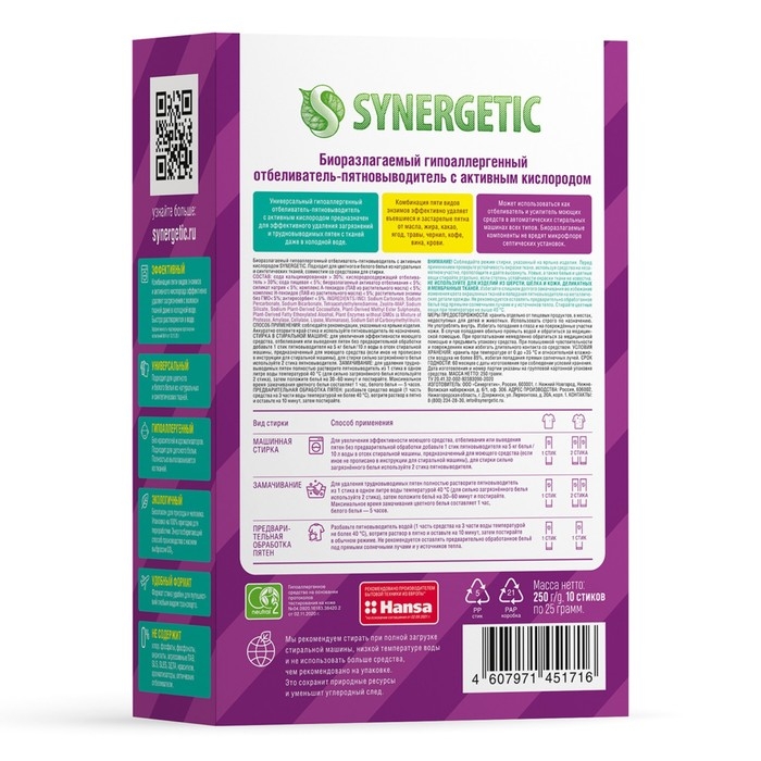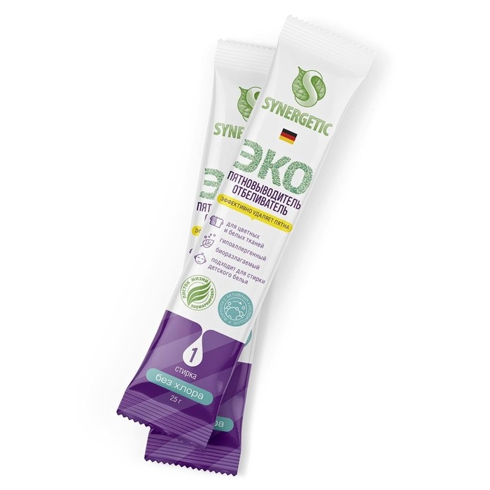 Биоразлагаемый гипоаллергенный пятновыводитель-отбеливатель с активным кислородом SYNERGETIC в стиках - универсальное средство для эффективного удаления загрязнений и трудновыводимых пятен с тканей даже в холодной воде.