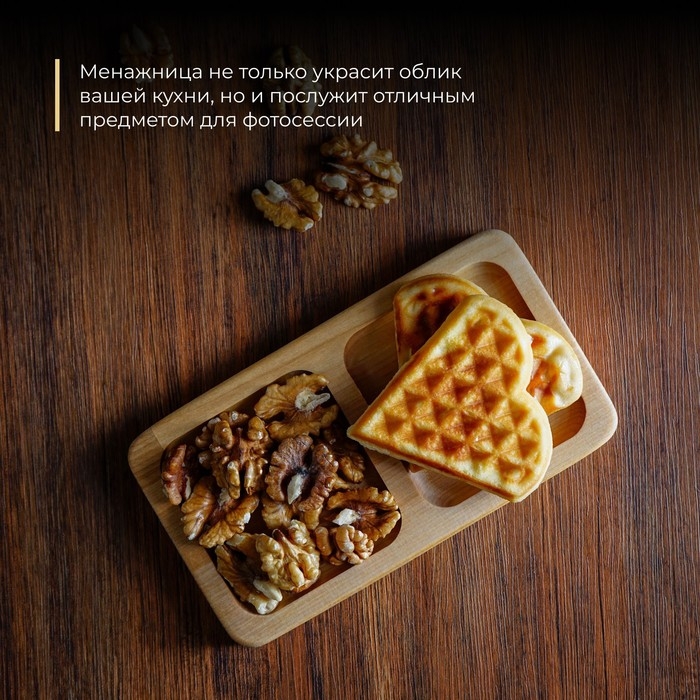 Никак не можете отучить себя от вредных перекусов? Изящная менажница из натурального дерева не даст вам пройти мимо орешков и сухофруктов. Изделие станет стильным и уютным элементом вашей кухни и незаменимым аксессуаром для сервировки стола.