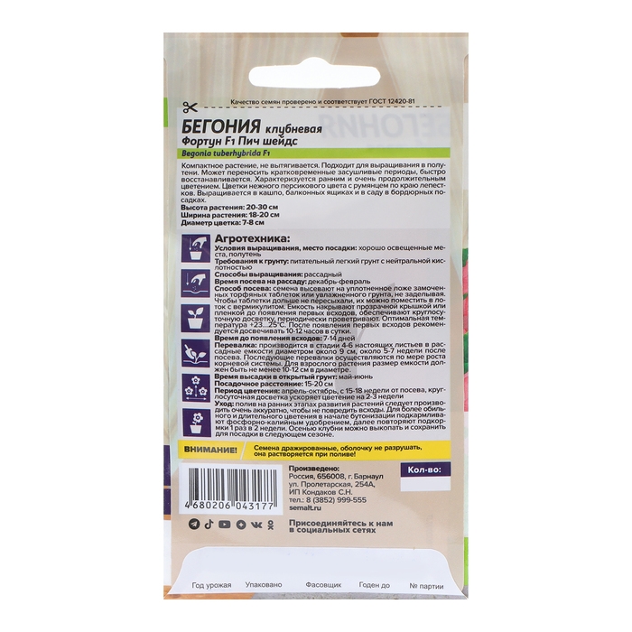 Семена цветов Бегония "Фортун Пич шейдс", клубневая, Сем. Алт, ц/п, 4 шт