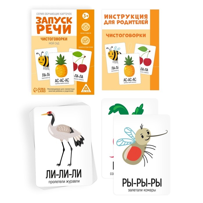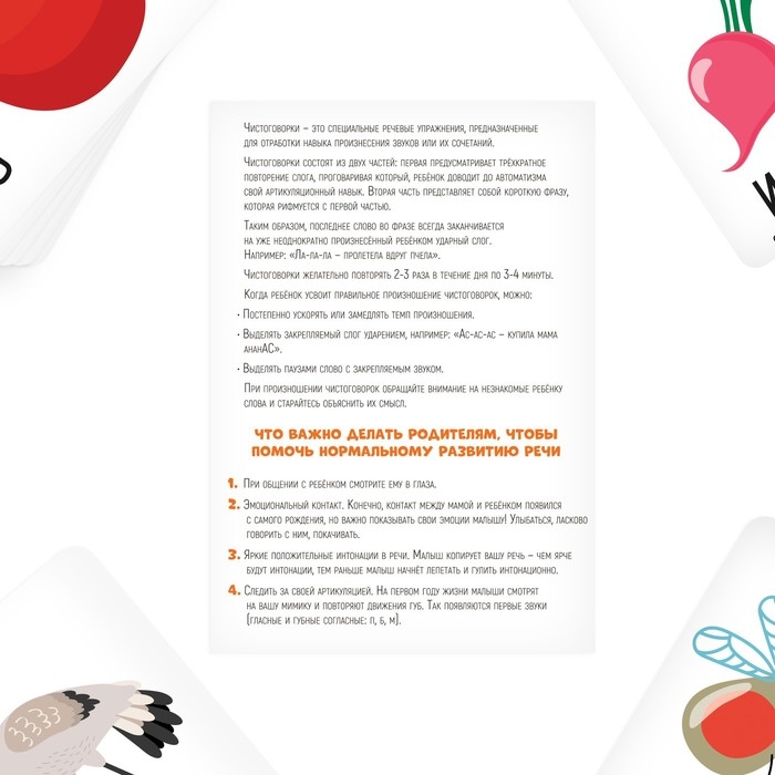 Перед вами набор обучающих карточек для развития речи, в которых малыша ждут забавные картинки и чистоговорки. Они научат ребёнка произносить сложные звуки, чувствовать ритм, улучшить произношение и позволят интересно провести время с родителями.