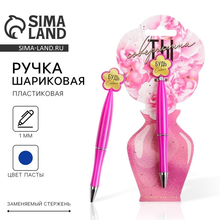 Ручка шариковая синяя паста, пластиковая с цветком «Ты совершенна» на подложке-ваза