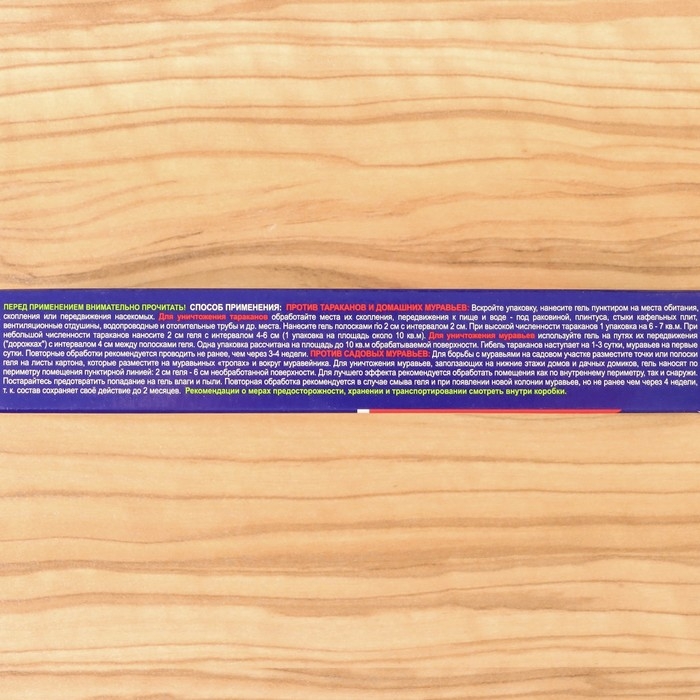 Способ применения: вскройте упаковку, нанесите гель пунктиром на места обитания, скопления или передвижения насекомых. Для уничтожения тараканов обработайте места их скопления, передвижения к пище и воде – под раковиной, плинтуса, стыки кафельных плит, вентиляционные отдушины, водопроводные и отопительные трубы и др. места. Нанесите гель полосками по 2 см с интервалом 2 см. При высокой численности тараканов 1 упаковка на 6 – 7 кв.м. При небольшой численности тараканов наносите 2 см геля с интервалом 4-6 см (1 упаковка на площадь около 10 кв.м). Для уничтожения муравьев используйте гель на путях их передвижения (“дорожках”) с интервалом 4 см между полосками геля. Одна упаковка рассчитана на площадь до 10 кв.м обрабатываемой поверхности. Гибель тараканов наступает на 1-3 сутки, муравьев на первые сутки. Повторные обработки рекомендуется проводить не ранее, чем через 3-4 недели.