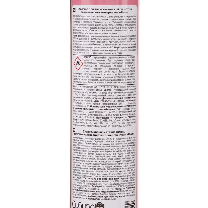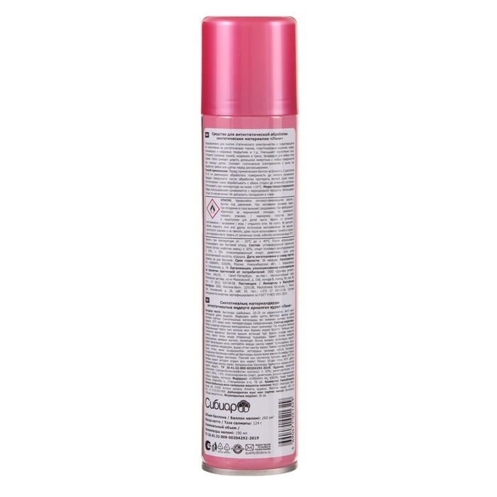 Состав: бутан/пропан/изобутан смесь 30%, спирт этиловый денатурированный 30% диалкилполиэтиленгликолевый эфир фосфорной кислоты 5%, соли цинка рицинолеиновой кислоты 5%, пэг-12 диметикон 5%, отдушка 5%.