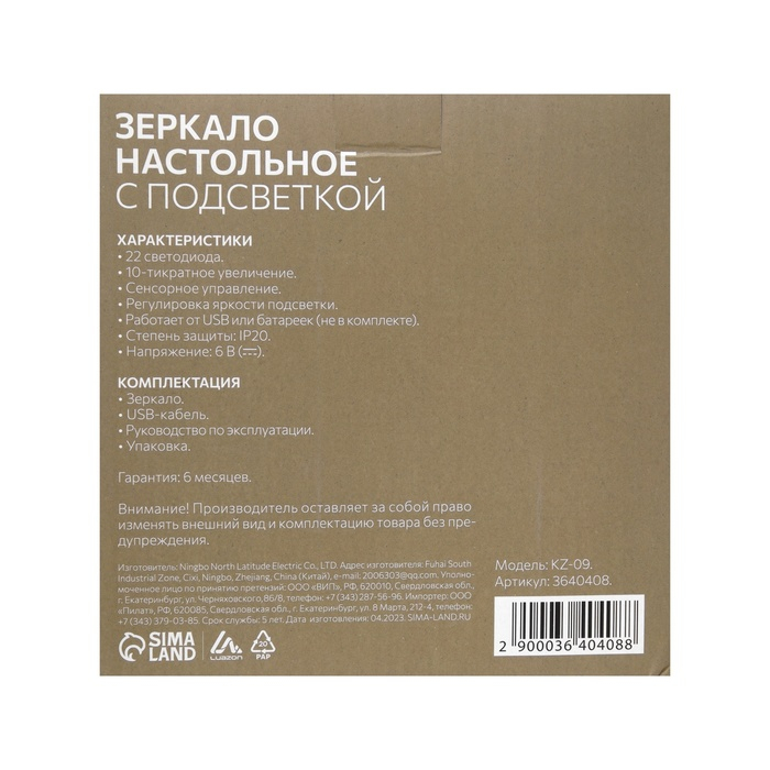 Зеркало Luazon KZ-09, подсветка, настольное, 30 × 16 × 16 см, увеличение х 10, USB, белое