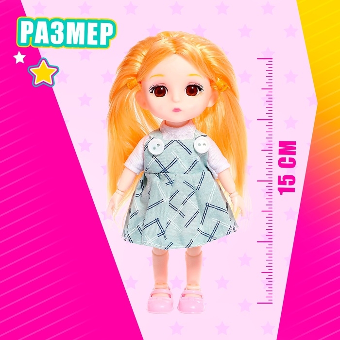 Кукла шарнирная полностью, высота — 15 см. В комплекте расчёска и зеркальце.