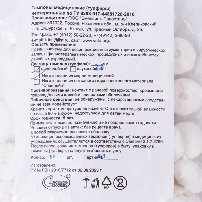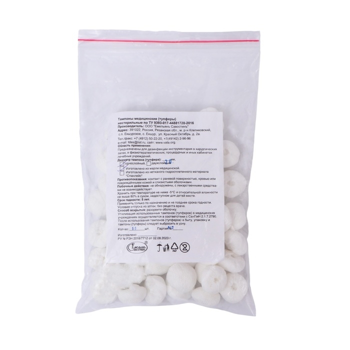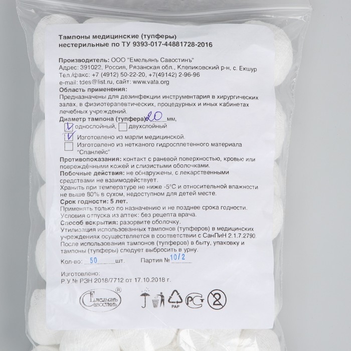 Тампоны Марлевые нестерильные, однослойные, плотность 32 гр/м2 d- 20мм 50 шт/уп