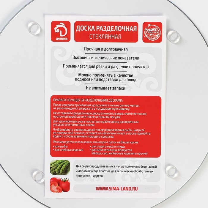 Стеклянная разделочная доска — это практичный аксессуар для нарезки продуктов, стильное украшение кухни и эффектная подставка для блюд. Стеклянная поверхность нейтрально относится к посторонним ароматам. Она не впитывает запахи и не поглощает влагу. Уход за изделием прост — достаточно промыть его под теплой водой и насухо вытереть салфеткой.