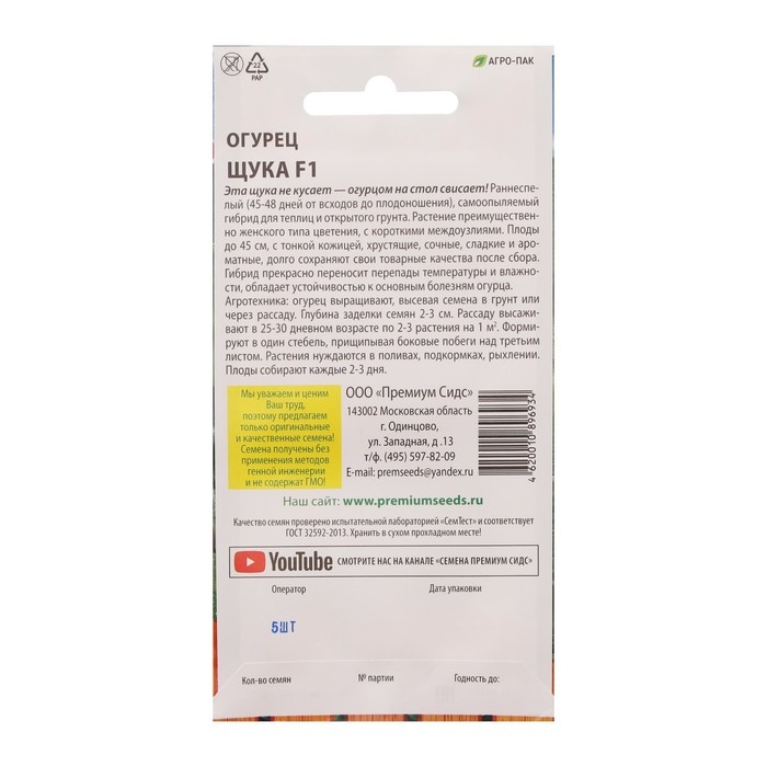 Эта щука не кусает – огурцом на стол свисает! Раннеспелый (45-48 дней от всходов до плодоношения), самоопыляемый гибрид для теплиц и открытого грунта. Растение преимущественно женского типа цветения, с короткими междоузлиями. Плоды с тонкой кожицей, хрустящие, сочные, сладкие и ароматные, долго сохраняют свои товарные качества после сбора. Гибрид прекрасно переносит перепады температуры и влажности, обладает устойчивостью к основным болезням огурца.