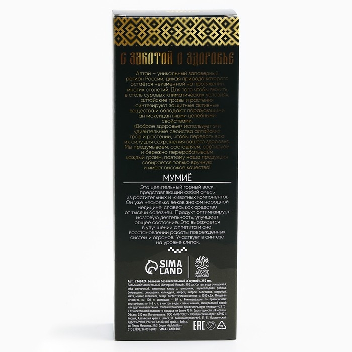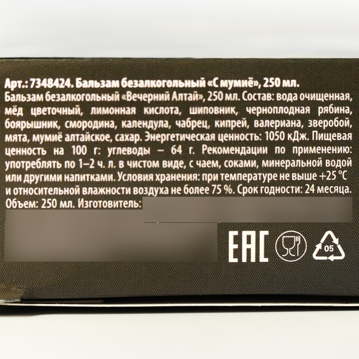 Состав: вода очищенная, мёд цветочный, лимонная кислота, шиповник, черноплодная рябина, боярышник, смородина, календула, чабрец, кипрей, валериана, зверобой, мята, мумиё алтайское, сахар.