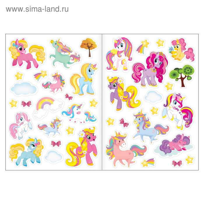 - Издание двустороннее: на одной стороне есть мини-рассказы о персонажах, на другой — красочное поле для наклеек.