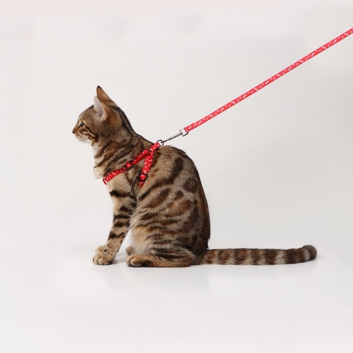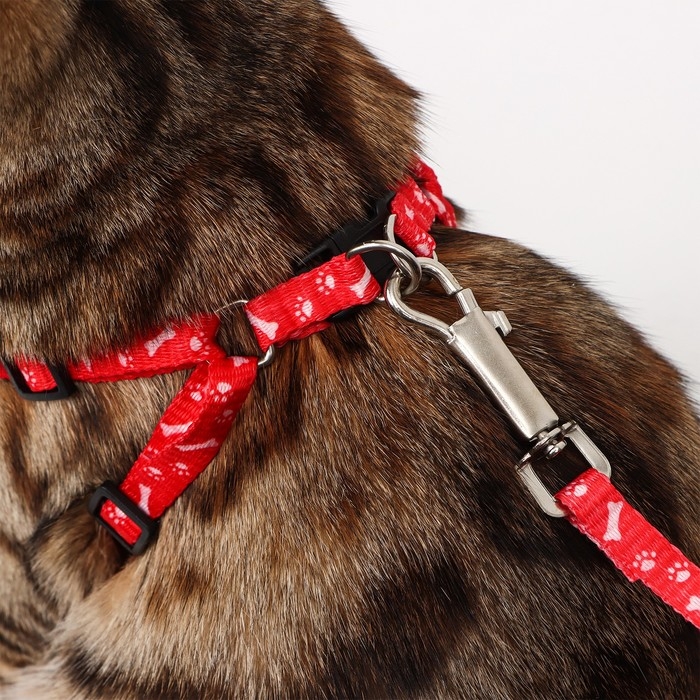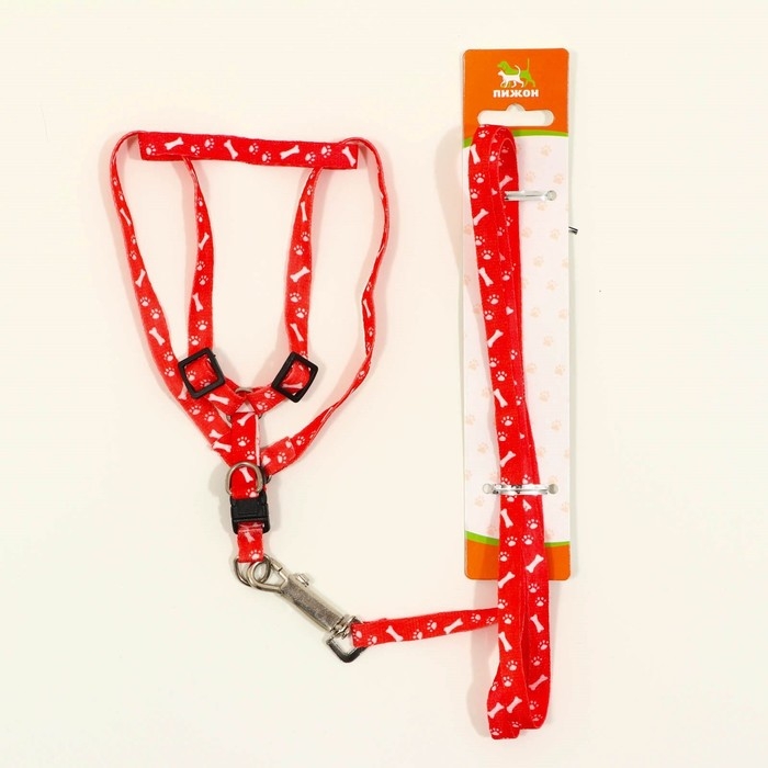 Комплект прогулочный включает в себя яркие шлейку и поводок, изготовленные из качественного капрона с использованием металлической и пластиковой фурнитуры.