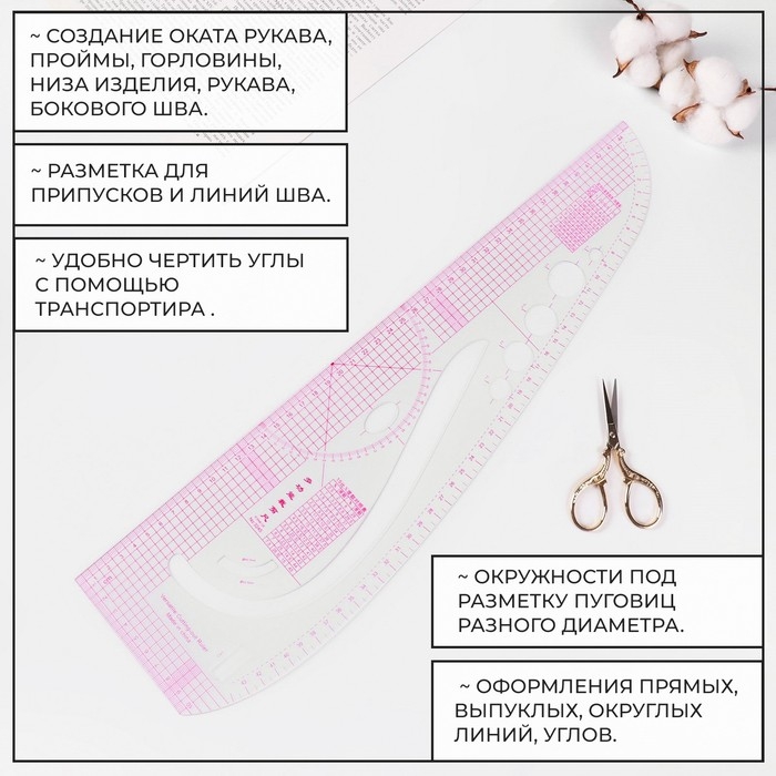 Лекало «Сапог» идеально подойдёт для создания оката рукава, проймы, горловины, низа изделия, рукава, бокового шва, разметки для припусков и линий шва. С помощью транспортира удобно чертить углы. Станет незаменимым помощником в построении окружности под разметку пуговиц разного диаметра и оформлении прямых, выпуклых, округлых линий, углов.