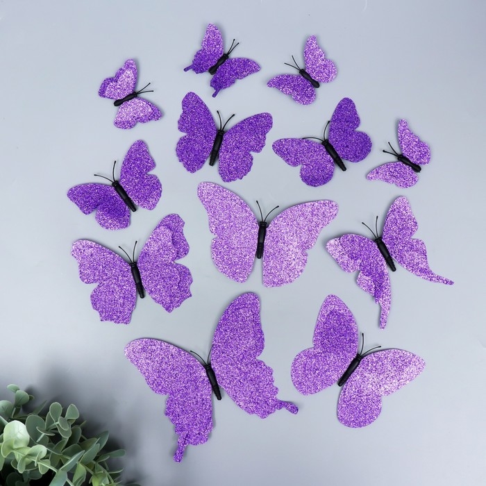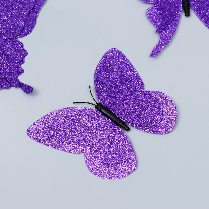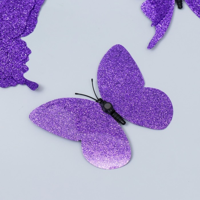 Магнит пластик "Бабочки двойные крылья - блеск" фиолетовый набор 12 шт