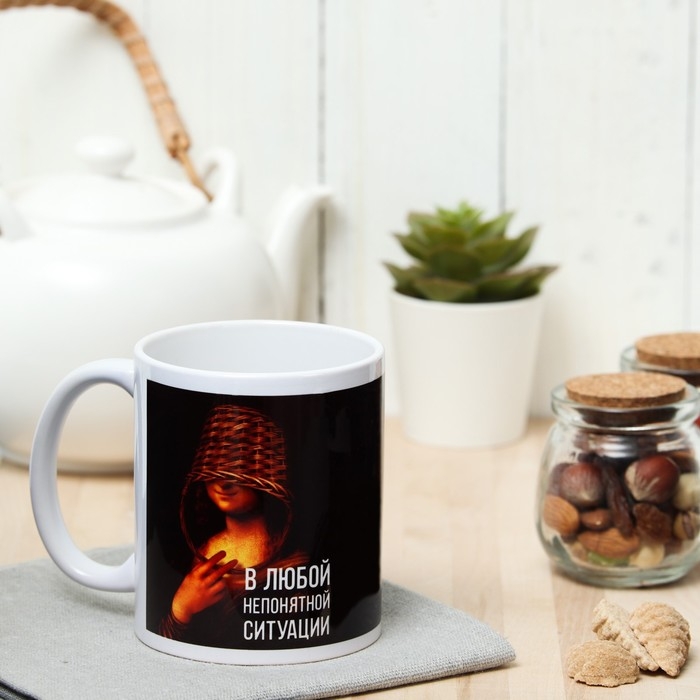 Кружка изготовлена из керамики. Рисунок нанесён методом сублимации, при котором краска проникает в верхний слой изделия, поэтому изображение получается стойким.