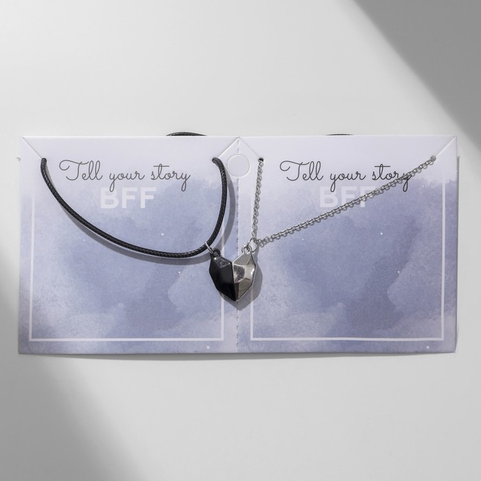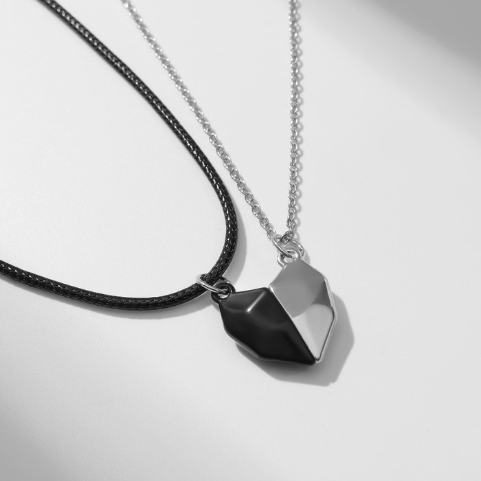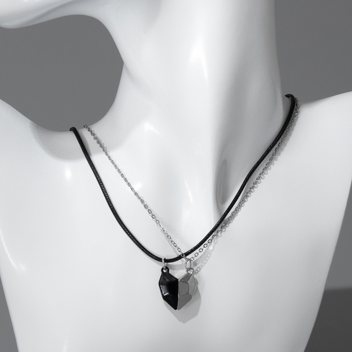 Кулоны «Неразлучники» на магните, половинки сердца, цвет чёрно-серебряный, 48 см