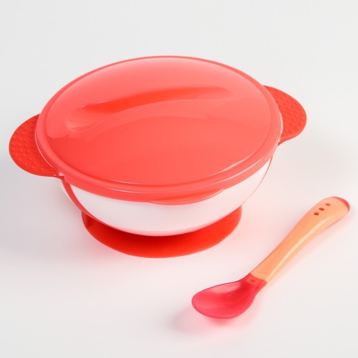Набор детской посуды: миска на присоске 340мл., с крышкой, термоложка, цвет розовый
