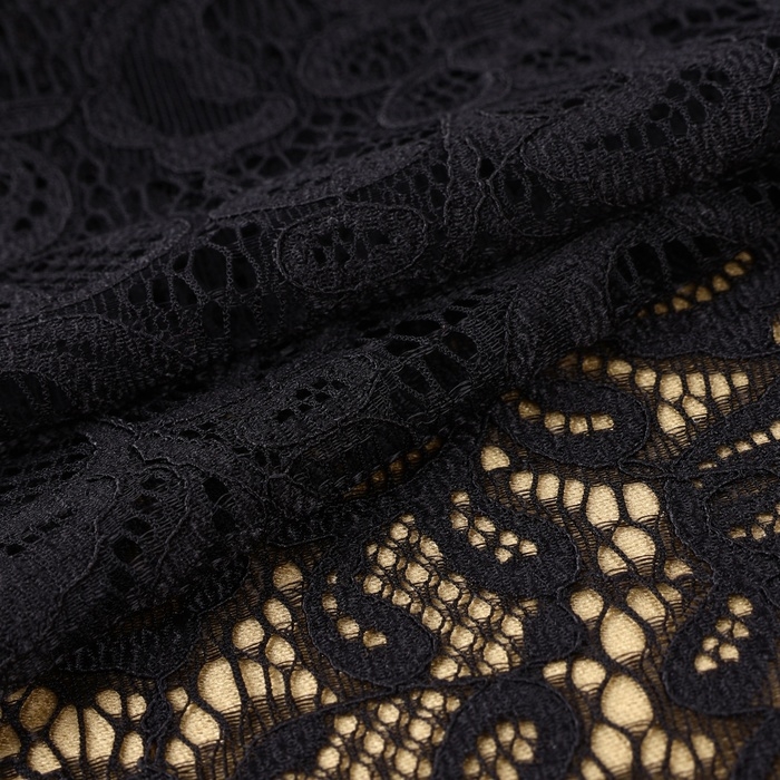 Эластичное кружевное полотно не имеет тканной основы. Благодаря своей пластичности кружево тянется, а переплетения нитей формируют воздушную выразительность.
