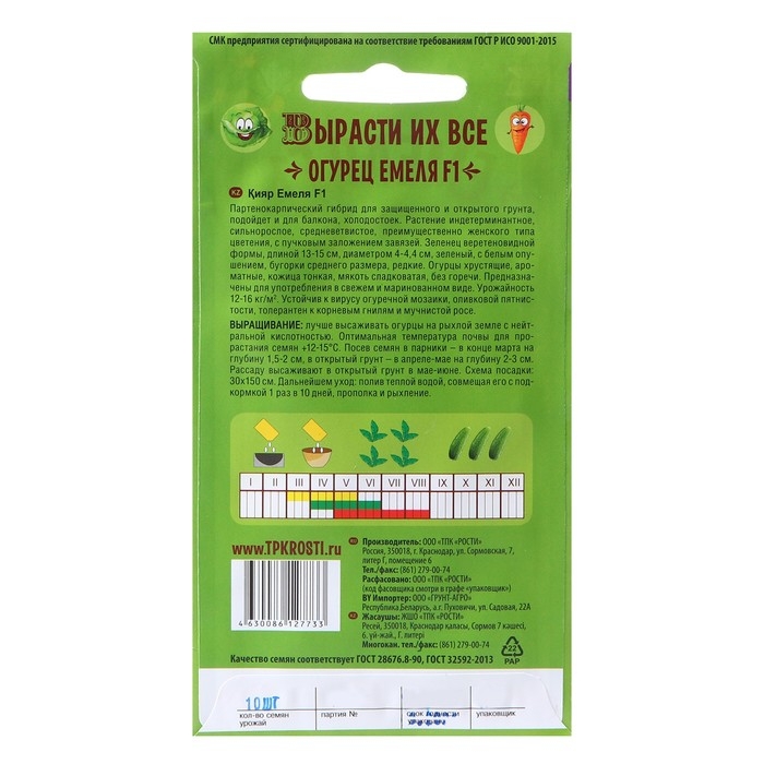 Огурец F1 Емеля - скороспелый урожайный партенокарпический гибрид женского или преимущественно женского типа цветения для весенних теплиц, тоннелей, открытого грунта. Растения сильнорослые, с укороченными междоузлиями; ветвление среднее или ниже среднего. Зеленцы интенсивно-зеленого цвета, крупнобугорчатые белошипые, овально-цилиндрической формы, длиной 13-15 см, очень высоких вкусовых качеств, хороши для засолки и консервирования. Для гибрида характерны дружная отдача урожая и повышенная холодостойкость. Урожайность F1 Емеля, несмотря на более короткие зеленцы, держится на уровне гибридов Зозуля и Апрельский, а в годы с ненастным летом превосходит их.
