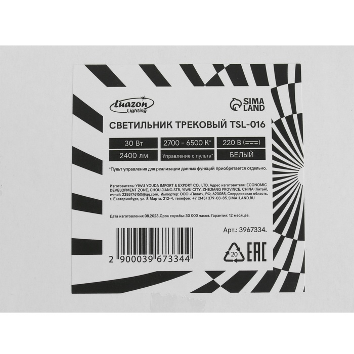Трековый светильник Luazon TSL-016, 30 W, 2400 Lm, 2700-6500, управление с пульта, БЕЛЫЙ