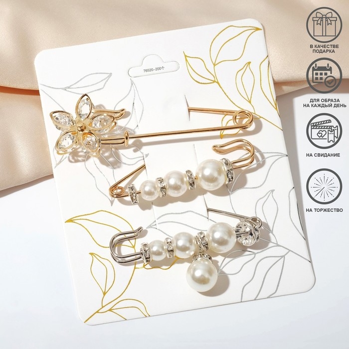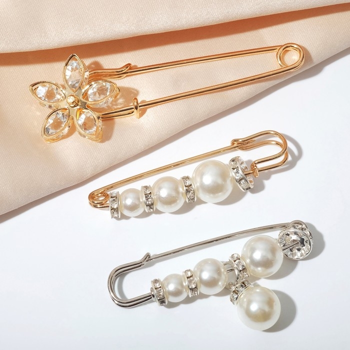 Данная булавка – настоящая находка для модниц, предпочитающих нетривиальные аксессуары. Брошь-булавка станет не только оригинальным дополнением вашего наряда, но и позволит без труда приколоть при необходимости палантин или шейный платок. Используйте её в качестве украшения шляпки, рубашки или галстука. Набор булавок (3 шт.) «Жемчужины и цветы», 7,5 см, цвет белый в золоте и серебре внесёт особую нотку изящности в ваш образ.