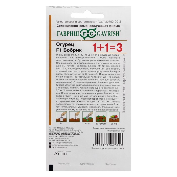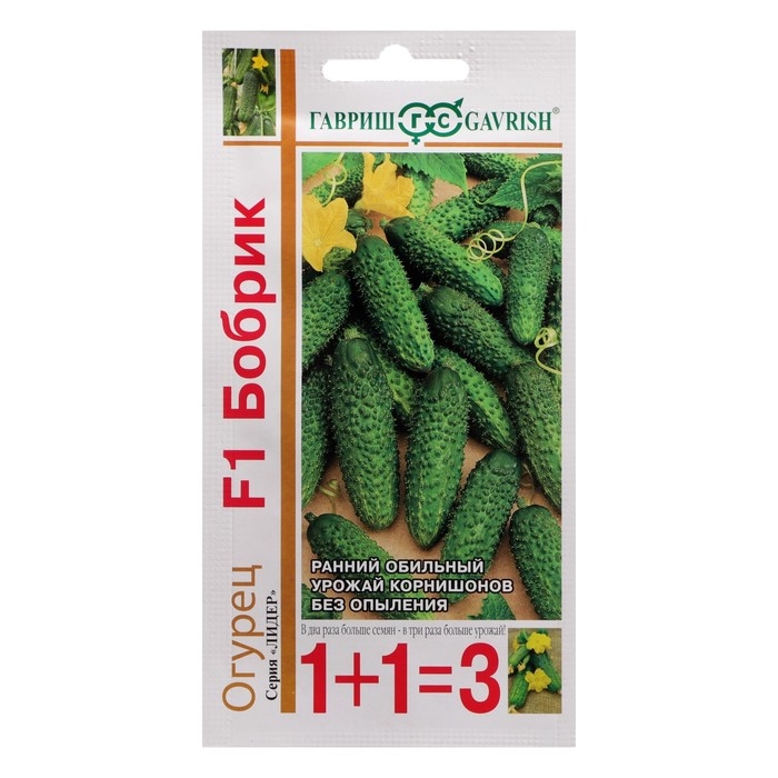 Семена Огурец корнишон "Бобрик F1", серия 1+1, 20 шт