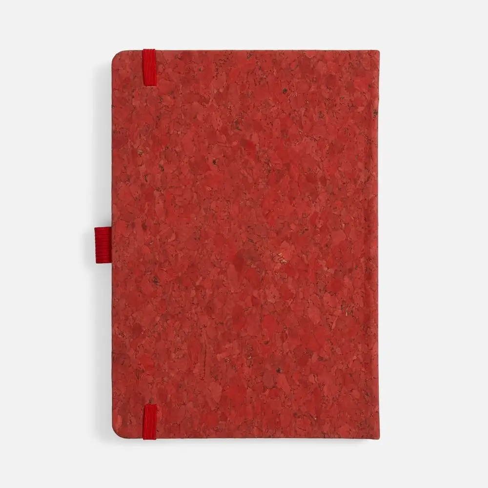 Блокнот с твердой обложкой из из натуральной окрашенной пробки, дополнен петлей-резинкой для ручки, ляссе и резинкой в цвет обложки.