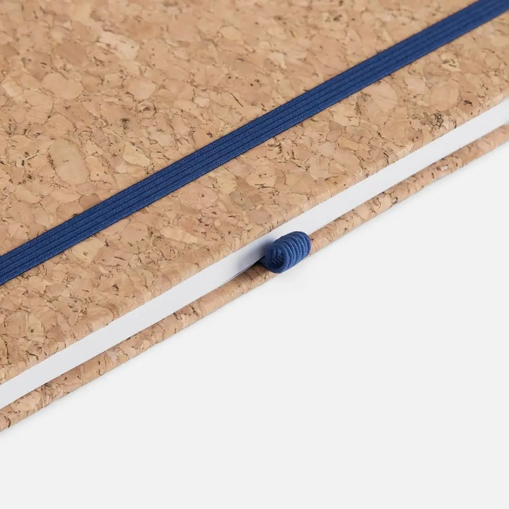 Блокнот в твердой обложке из натуральной неокрашенной пробки, дополнен цветными петлей-резинкой для ручки, ляссе и резинкой на обложку.