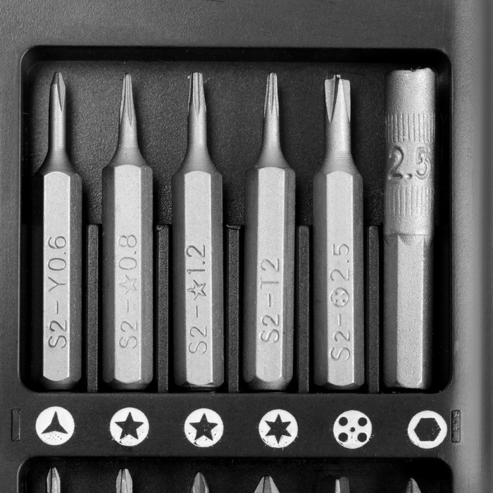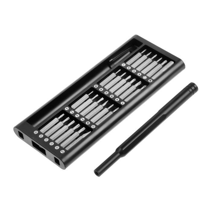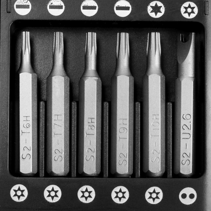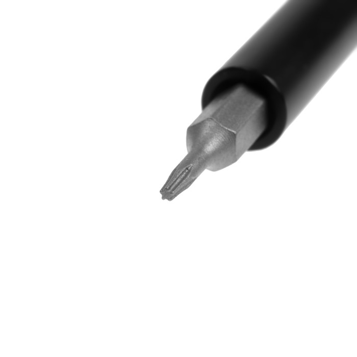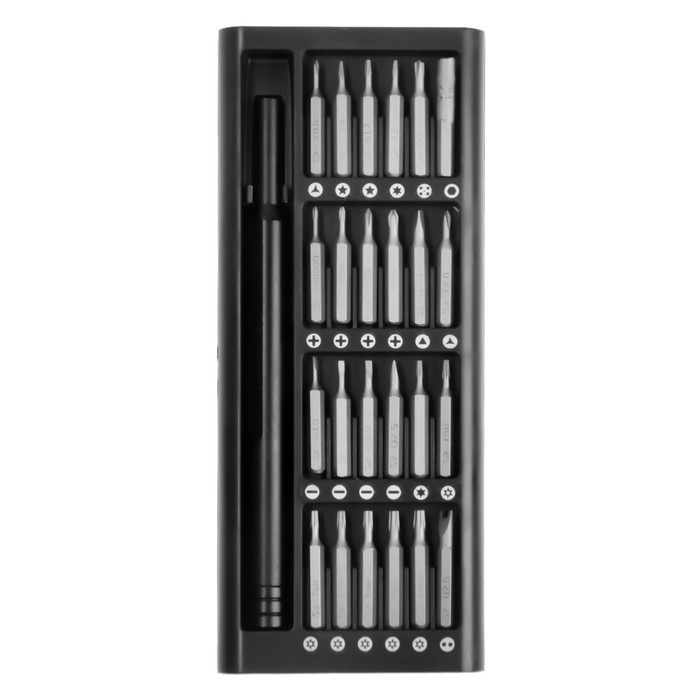 Набор бит с металлическим держаталем предназначен для точных работ. Подходит для креплений в iPhone. Биты изготовлены из высокопрочной стали S2, твёрдостью 58–62 HRC. Благодаря намагниченному ложементу биты всегда уверенно держатся в нём и в держателе-отвёртке.