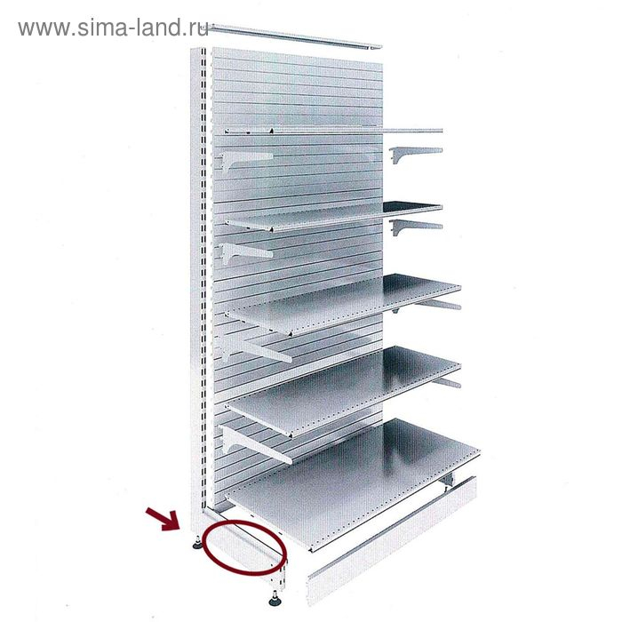 Опора торгового стеллажа держит весь стеллаж глубиной 400 мм строго вертикально. Комплектуется регулируемыми ножками для устойчивости на неровной и наклонной поверхности и болтами для надёжного крепления к стеллажу.