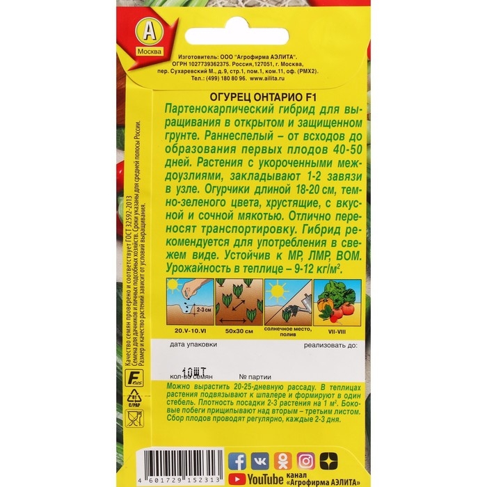 Семена Огурец "Онтарио", F1, ц/п, 10 шт