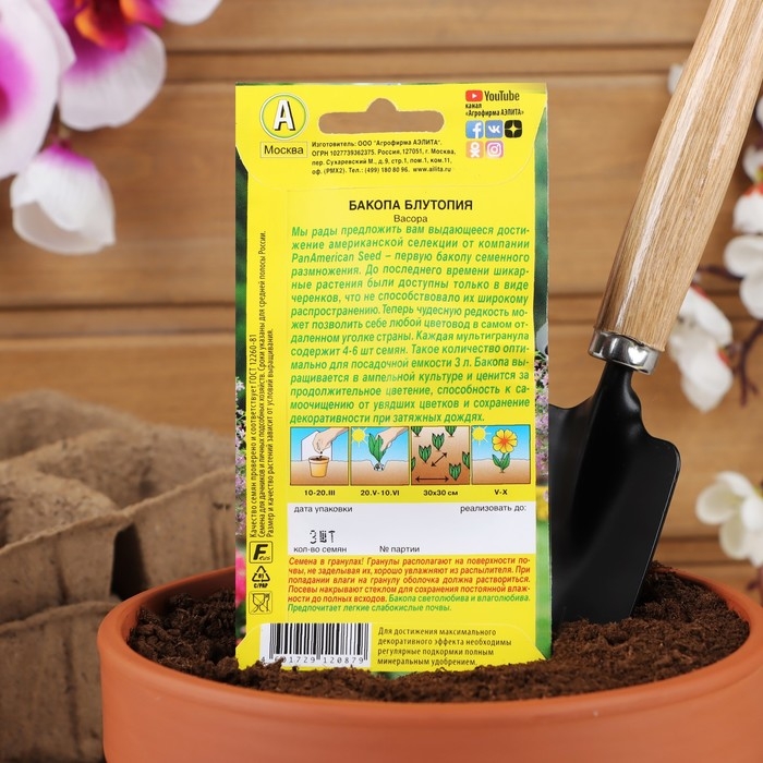 Семена в гранулах! Гранулы располагают на поверхности почвы, не заделывая их, хорошо увлажняют из распылителя. При попадании влаги на гранулу оболочка должна раствориться. Посевы накрывают стеклом для сохранения постоянной влажности до полных всходов. Бакопа светолюбива и влаголюбива. Предпочитает легкие слабокислые почвы.