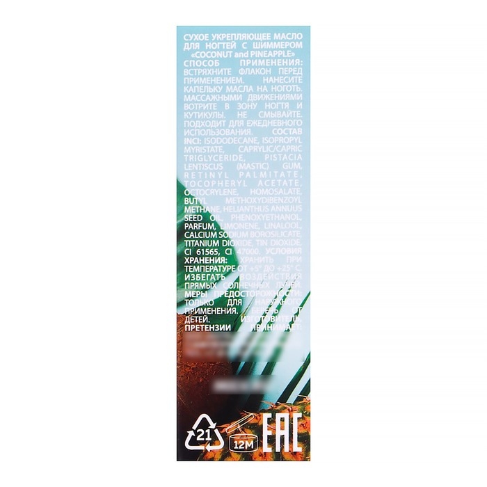Сухое укрепляющее масло для ногтей с шиммером «COCONUT and PINEAPPLE» приятно наносить на кожу. Лёгкая консистенция обеспечивает быстрое и глубокое впитывание, оставляя на коже бархатистое ощущение. Благодаря специально разработанной формуле масло защищает от сухости, питает, придаёт рукам ухоженный вид, при этом не оставляет липких следов, жирного блеска и ощущения плёнки. Блестящий уход и обогащение: смола мастикового дерева в составе средства повышает прочность ногтей при ежедневном использовании в течение 1 месяца, тропический аромат кокоса и ананаса поднимает настроение, мелкие частицы придают коже мерцающее сияние.
