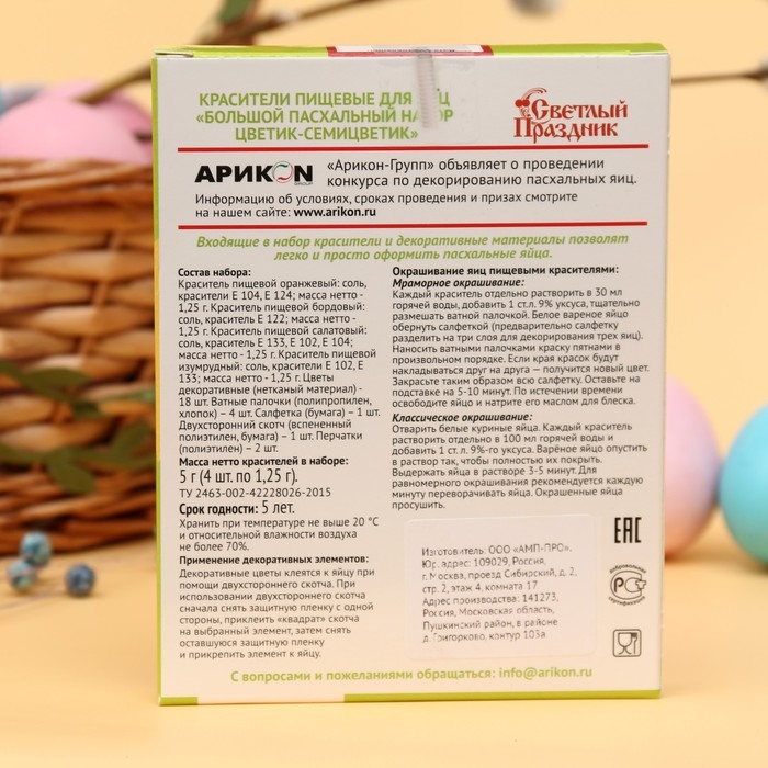 Входящие в набор красители и декоративные материалы позволят легко и просто оформить пасхальные яйца, а картонные заготовки - собрать оригинальные подставки для яиц.