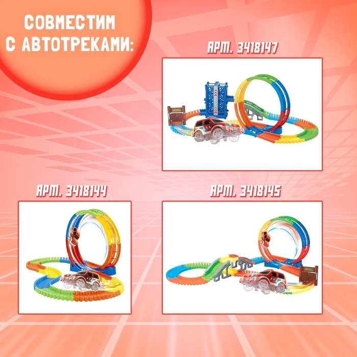 Пришло время эффектных световых шоу — скоростных заездов на гибком треке! Постройте крутую трассу с мостами, спусками, подъемами и мёртвыми петлями и запускайте по ней эту машинку! Ни один юный гонщик не останется равнодушным!