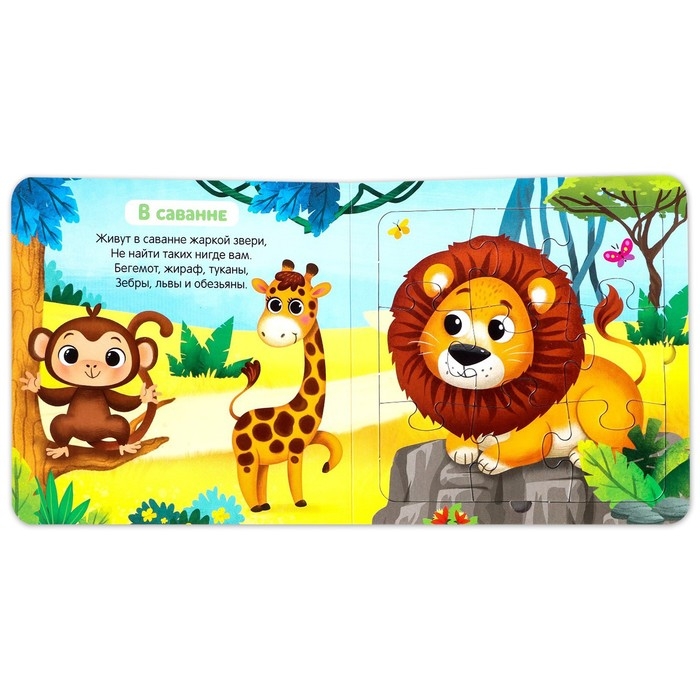 В этой чудной книге малыша ждут не только добрые животные и стихи, но и пазлы. Собирайте их вместе с малышом, чтобы запомнить всех зверей и узнать, где они обитают.