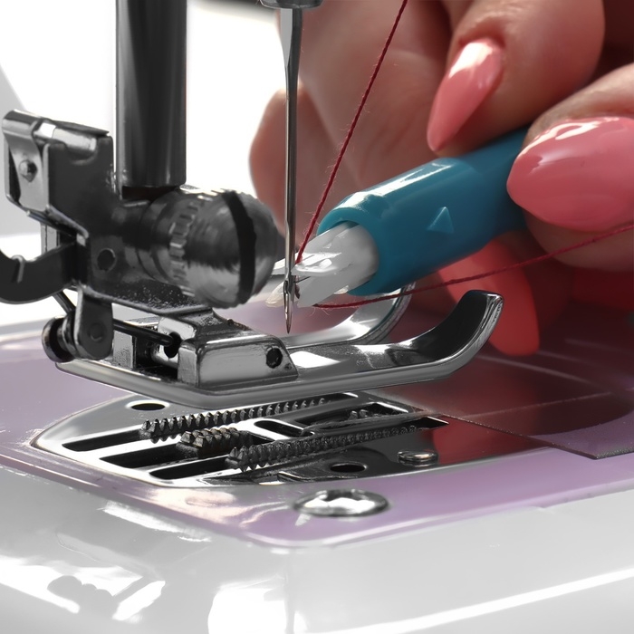 Толкатель нити закрыт подвижной пластиковой частью, его ширина меньше одного милиметра. На металлическом толкателе имеется о-образный вырез, куда попадает нитка, а после вставляется в игольное отверстие. Главное правильно расположить нитевдеватель на игле, чтобы не сломать тонкий металлический толкатель нити.