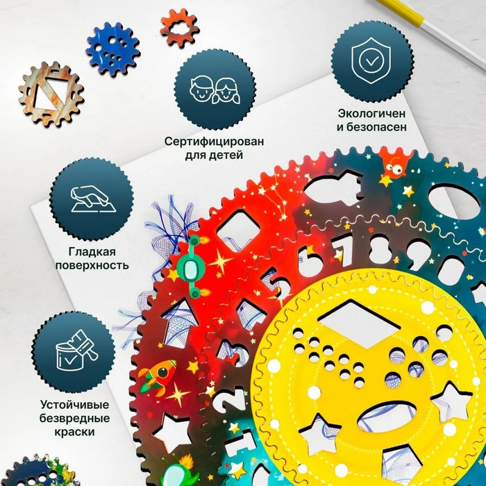 Спирограф — многофункциональная деревянная развивающая игрушка для рисования. Он имеет яркое оформление с тематическими изображениями, состоит из 2 зубчатых колёс с фигурными трафаретами и 5 кругов-шестерёнок.