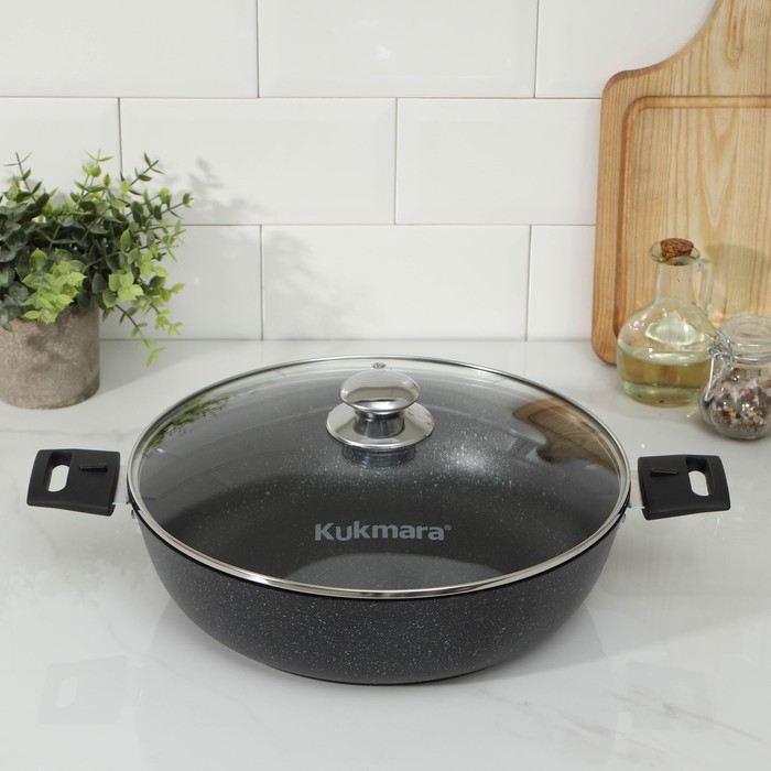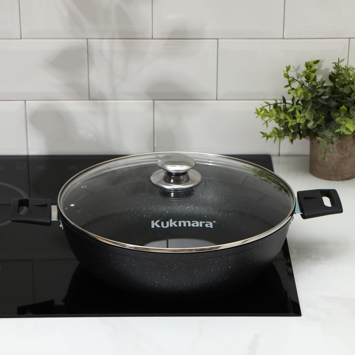 Посуда Kukmara «Мраморная» изготовлена из литого алюминия и покрыта инновационным антипригарным мраморным покрытием на водной основе, усиленным сверхтвёрдыми частицами минералов.