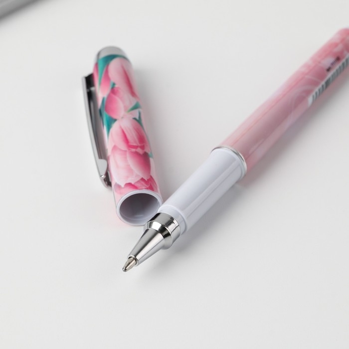 Ручка шариковая синяя паста, пластиковая с цветком "С 8 Марта"